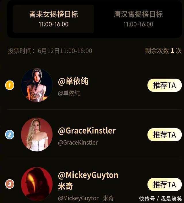 另一位揭榜歌手者来女的挑战候选东谈主则为:单依纯、格瑞丝·金斯勒、米奇·盖顿。