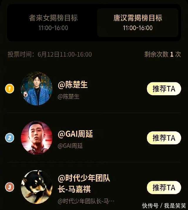 鸠合投票已揭晓挑战名单,唐汉霄将在陈楚生、GAI周延、马嘉祺中遴荐一位发起挑战。