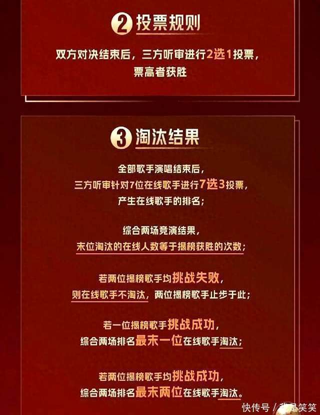 若仅有一位揭榜歌手顺利解围,则空洞两场竞演收获,排名垫底的在线歌手将被淘汰;若两位揭榜歌手均顺利,则空洞两场竞演收获,排名末尾的两位在线歌手将缺憾离场。